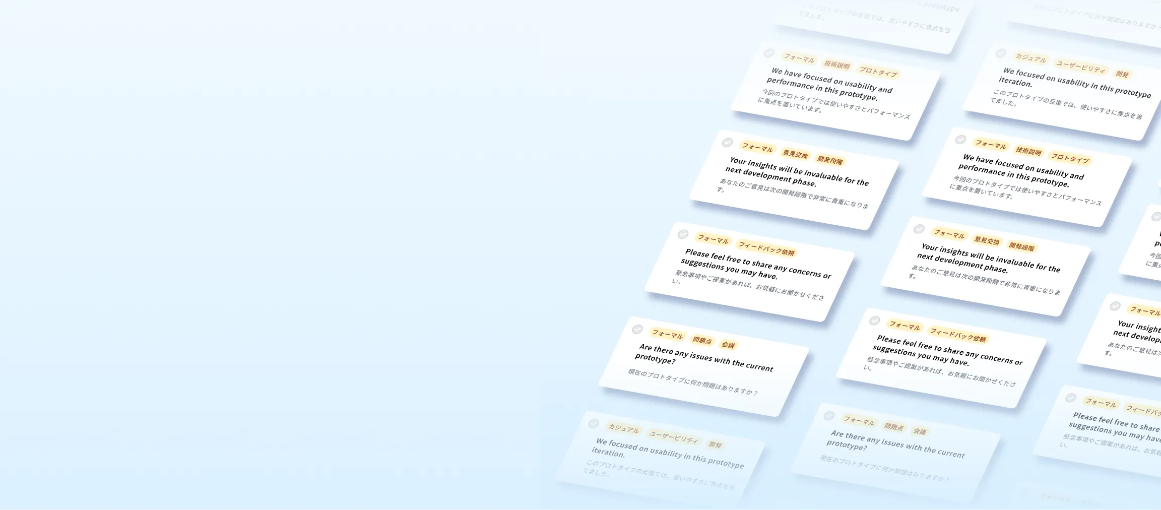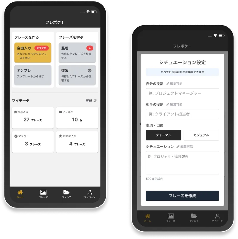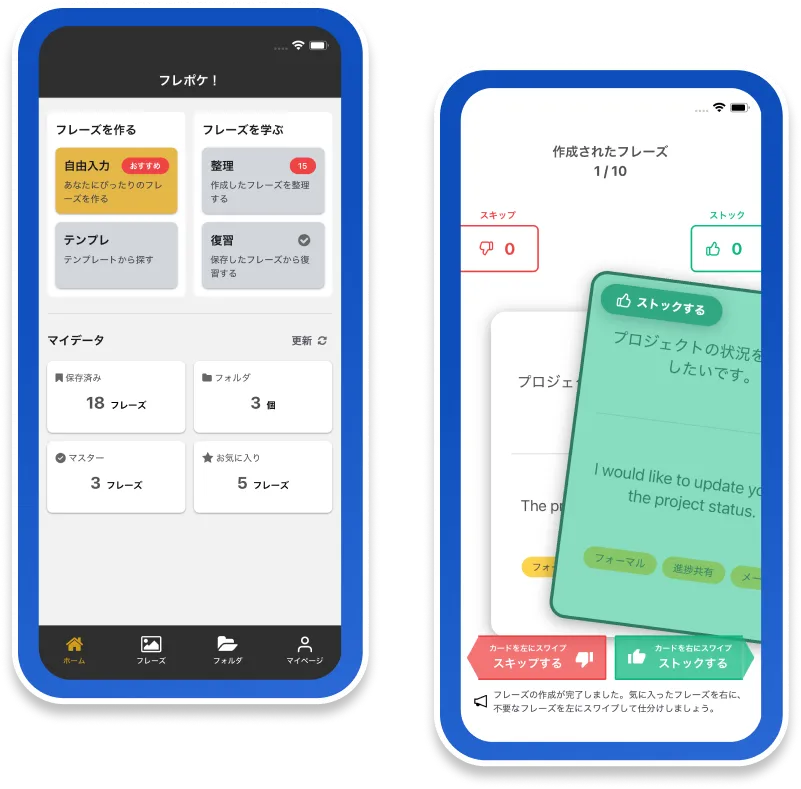 生成されたフレーズをスワイプで「選別」し、フォルダに「整理」。「その場限りの情報」を、あなただけの「学習資産」として構築します。