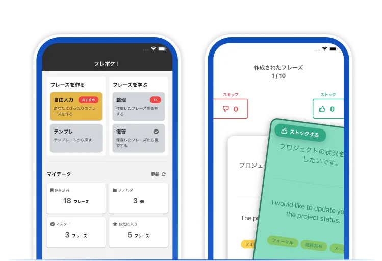 ストックしたフレーズは、自動でフラッシュカードに。発音練習機能や文法解説もあり、「丸暗記」を「自分の言葉(スキル)」に変えます。